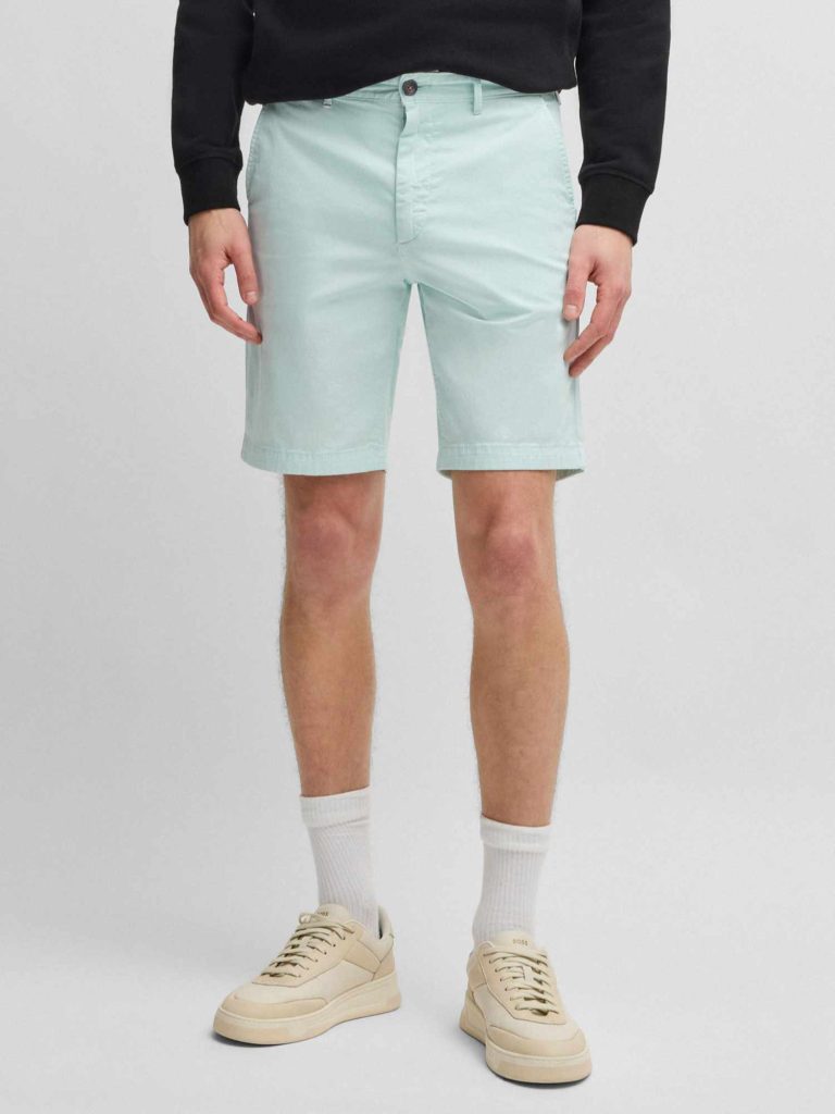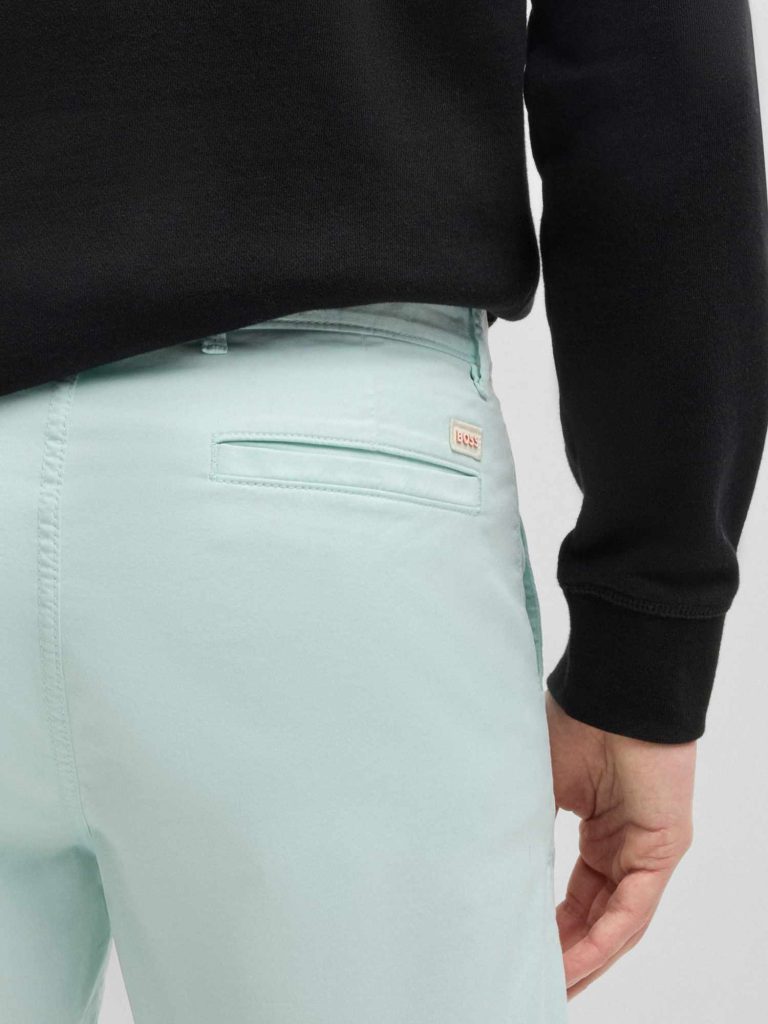 Shorts Boss, color aguamarina, con cierre de cremallera y botón, dos bolsillos delanteros y dos traseros. Corte ajustado. Temporada Primavera/Verano 2025.